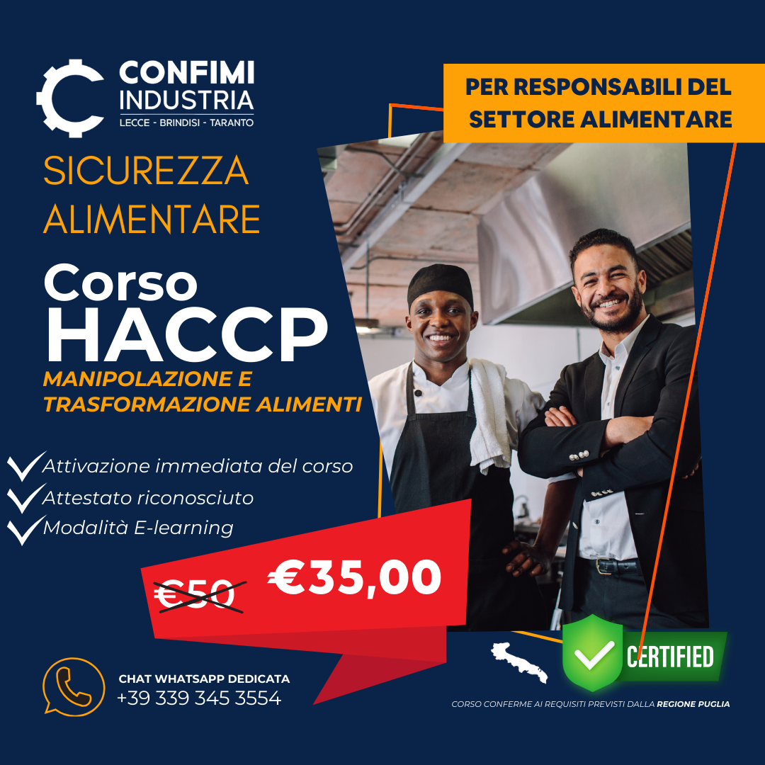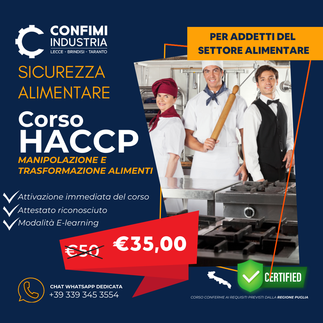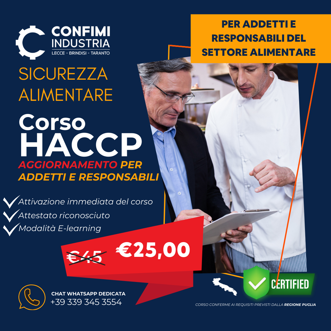 L’HACCP (Hazard Analysis Critical Control Point) rappresenta per l’industria alimentare la fonte principale per l’autocontrollo igienico sanitario ed è obbligatorio per garantire la salute e la tutela dalle contaminazioni alimentari. Il corso è indispensabile e rappresenta un obbligo di legge ed è fondamentale per essere in regola con la propria attività.